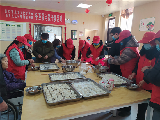 12月21日,冬至,周口市慈孝文化促進會、川匯區社區建設管理局的志愿者們來到川匯區荷花路街道綜合養老服務中心,聯合開展“冬至敬老餃子宴”活動。