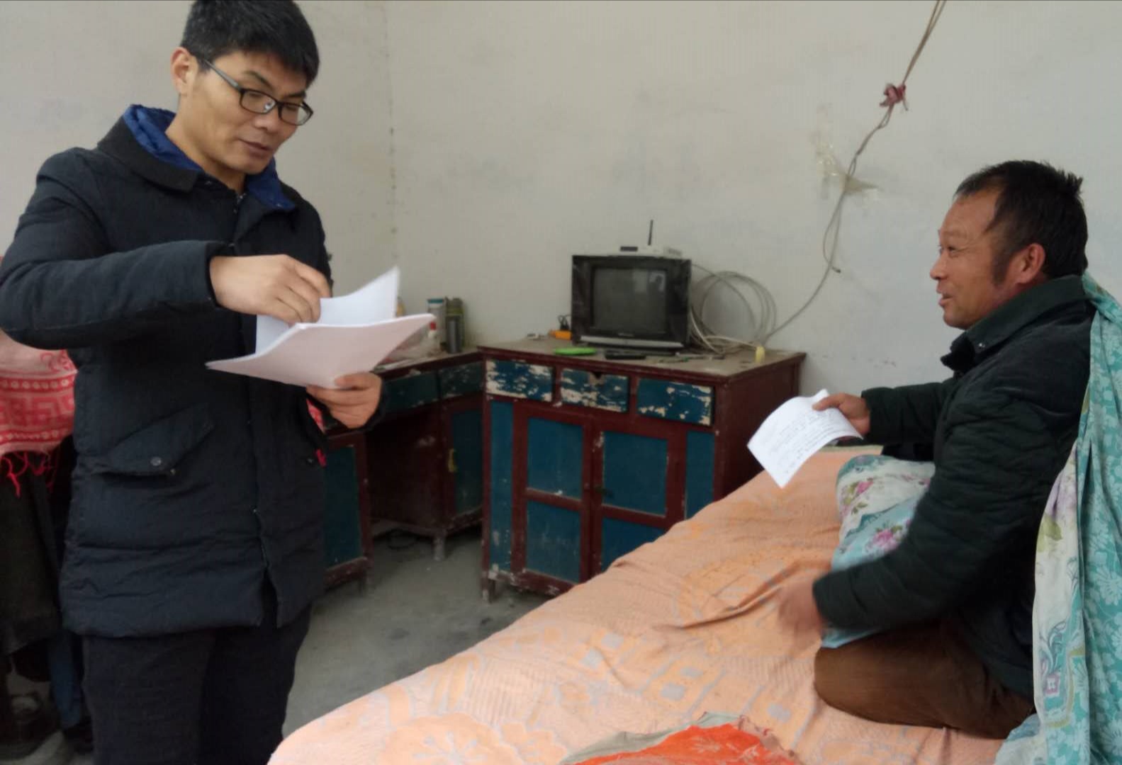 圖片說明:位全峰(左)到北嶺村殘疾貧困戶家中了解情況,講解殘疾貧困戶應(yīng)享受的扶貧政策。
