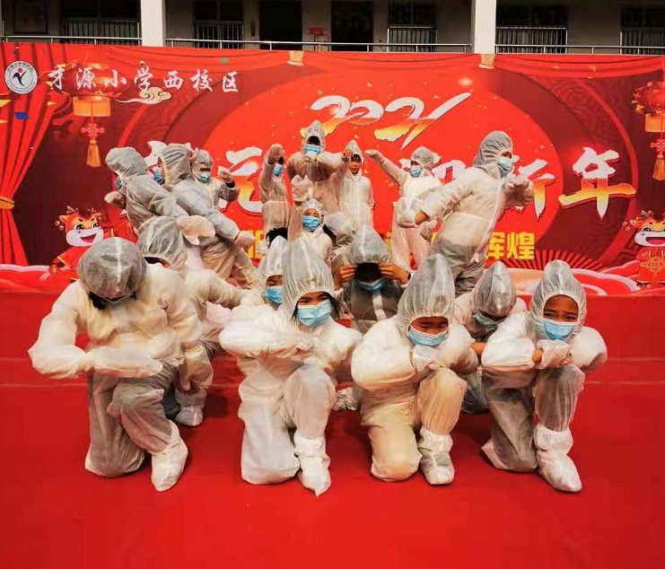 在該縣才源小學(xué)西校區(qū),三年級三班、四班、六班、八班合作編排了《與時間賽跑》情景劇,充分展示了在抗擊疫情期間,醫(yī)護人員奮勇當(dāng)先的責(zé)任擔(dān)當(dāng),逆行出征的義無反顧,風(fēng)雨兼程的無私奉獻。舞臺上,孩子們的精彩表演,獲得了陣陣掌聲。