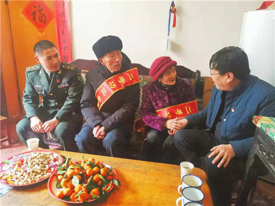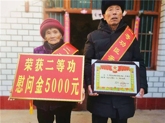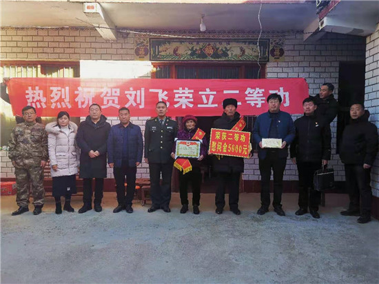 近日,周口市淮陽區人武部與區退役軍人事務局相關領導,來到該區四通鎮孔北行政村劉莊村,為在部隊榮立二等功的現役軍人劉飛的父母送去立功喜報,并送上慰問品及慰問金。臨走,劉飛的父親劉啟來說:“請領導放心,俺會讓孩子在部隊更加安心服役,力爭取得更大成績,多為家鄉增光添彩。”(張然 張雙斌 攝影報道)