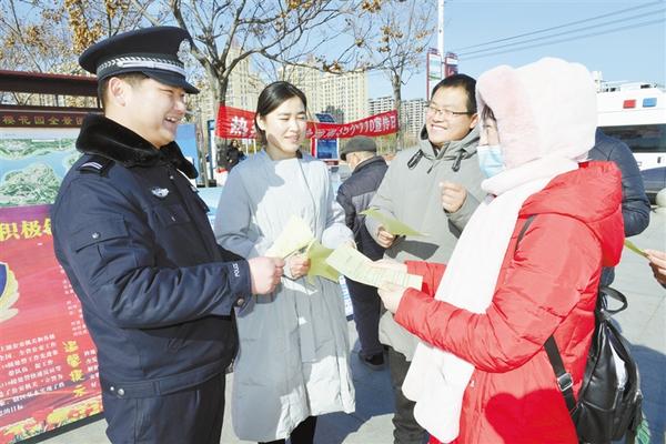 今年1月10日是第35個“110宣傳日”,也是首個“中國人民警察節”。我市公安系統圍繞“一心為民110,砥礪奮進新征程”這一主題,開展了大型宣傳活動。圖為扶溝公安民警向群眾發放宣傳資料。