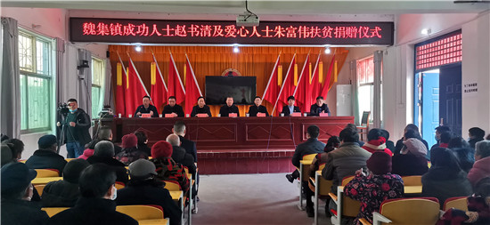 1月29日,天氣乍暖還寒,魏集鎮(zhèn)政府人頭攢動,喜氣洋洋,一片熱鬧的景象。內(nèi)蒙古希拉穆仁旅游置業(yè)開發(fā)有限公司董事長、內(nèi)蒙古楊子照明鋼桿制造有限責(zé)任公司董事長、內(nèi)蒙古周口商會會長趙書清和愛心人士朱富偉一行,帶著整整兩卡車米、面、油共計八萬元生活物資,回到家鄉(xiāng)魏集鎮(zhèn)開展扶貧濟困活動,在嚴寒的冬日給魏集鎮(zhèn)困難群眾帶來了溫暖和祝福。縣政協(xié)主席孫培忠,縣委常委、宣傳部長李本磊出席活動。魏集鎮(zhèn)黨委書記衛(wèi)春忙,鎮(zhèn)長劉艷光參加活動。