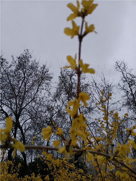 黃色的迎春花似云霞滿天,白色的玉蘭花婀娜多姿,紅色玉蘭含苞待放,即將飄零的臘梅老也留戀枝頭,舍不得離去,鮮艷的百花醉得垂柳在水面上扭起纖細的枝條。