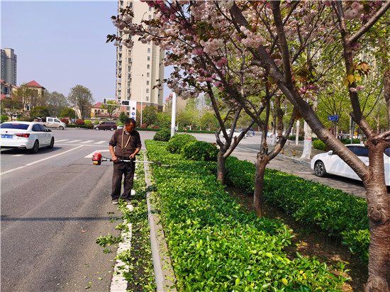 4月8日上午,周口市城鄉一體化示范區的園藝工人正在修剪周口大道綠化帶里的綠植。