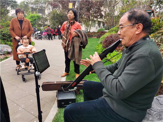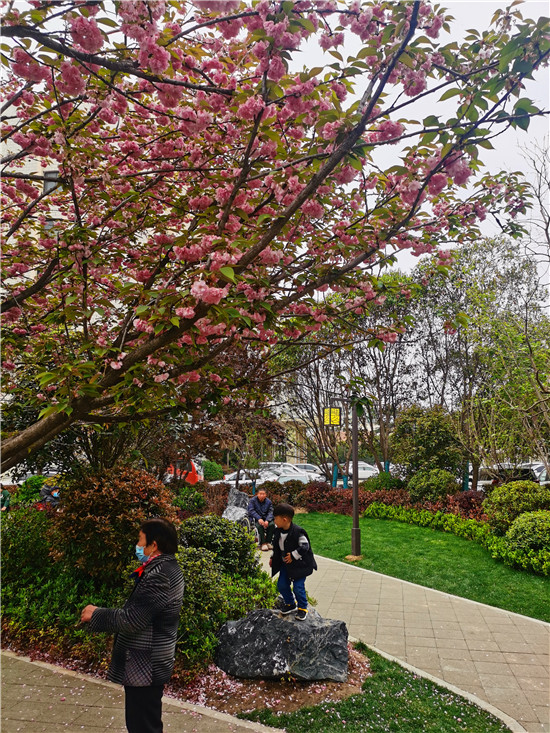 4月12日,中心城區文明路與七一路交叉口的街頭游園內,櫻花盛開,綠坪如茵,老人們在自娛自樂,很是幸福愜意。