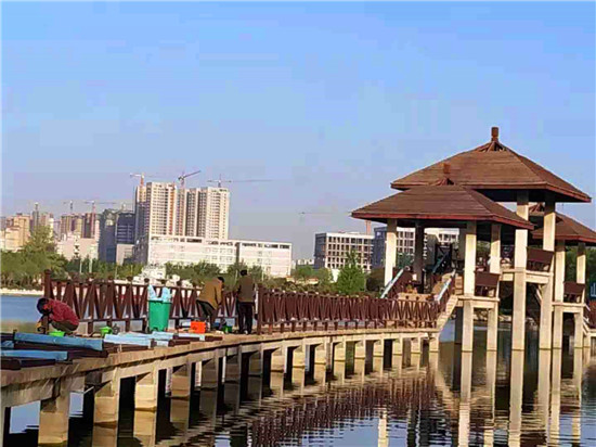 近日,位于文昌大道的周口公園啟動了對水上棧道的維修。周口公園的水上棧道和亭榭是一道美麗的風景,成為人們游園打卡之地,然而因建造時用的是木材,歷經(jīng)風雨,朽壞嚴重,存在安全隱患,周口公園方面于去年將之封閉。記者在現(xiàn)場看到,工人已經(jīng)將木質(zhì)扶欄、道上木板拆除,正在安裝鐵護欄。鐵護欄油漆成棕褐色,依然保持原棧道的風格和色調(diào)。②7