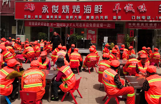 4月29日中午,200多名環衛工人在商水縣城丘生路一飯店內聚餐。為表達對環衛工人的敬意,讓他們過一個愉快的五一節,該飯店從4月29日至5月1日分三批邀請全縣600多名環衛工在此免費享用午餐。②7