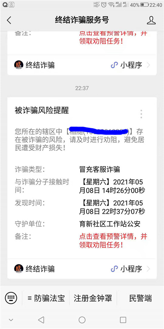 5月8日,鄲城縣公安局南關派出所社區民警收到“金鐘罩”推送的反詐預警信息,轄區居民郭某有受騙風險,社區民警第一時間聯系郭某核實了解相關情況并及時予以制止。