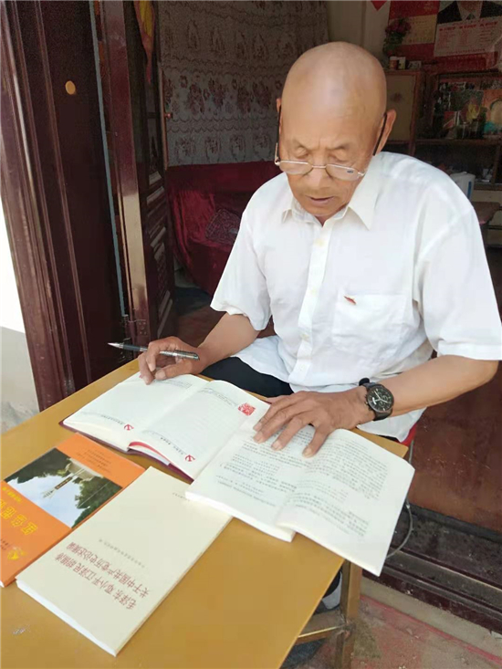 “老王,記者來采訪你了。”進得庭院,一同前往的西王營行政村婦聯(lián)主任王玉真高聲叫道。聽到有人前來,正在屋內(nèi)看書的王加科放下書本走了出來,熱情地把我們往屋里讓,他胸前佩戴的毛主席像張和黨徽在陽光的照耀下閃閃發(fā)光,“從我嫁到這里,覺得老王胸前的毛主席像章就沒有摘掉過。”王玉真一邊走一邊說道。堂屋正中央的墻壁上端端正正的懸掛著毛澤東主席和習(xí)近平總書記畫像,畫像下方一張方桌、一對沙發(fā)和一個條幾就是全部家具。小方桌上放著《習(xí)近平關(guān)于“不忘初心 牢記使命”論述摘編》和《紅色記憶》兩本書籍和一大一小兩個筆記本。老人拿起那個已經(jīng)發(fā)黃破舊的小筆記本說,那個小本子已經(jīng)陪他好多年了,小筆記本的扉頁上是王加科老人多年前抄寫的“入黨誓詞”,最后的紙張上寫著“不忘初心,永遠緊跟共產(chǎn)黨,黨指揮到哪里,我就跟到哪里”,翻開《習(xí)近平關(guān)于“不忘初心 牢記使命”論述摘編》,里面許多文字下面劃了橫杠,“我的文化程度不高,還是在部隊學(xué)會了一些字,許多字不會寫,就在重要的內(nèi)容下面用符號標(biāo)記,筆記上的好多字和符號你們認不出來,但是我自己知道。”看記者拿起書籍翻看,王家科老人似乎有些不好意思的說到,“不論到啥時候,入黨誓詞不能忘,要時刻記在心里,要始終以百姓的心為心。”