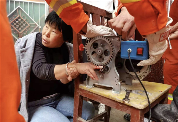 到達現場后,指戰員發現一女子的右手食指被卡在壓面機齒輪中,情況緊急。指戰員迅速制訂救援計劃,分兩組實施救援,一組照看被困人員情況,安撫情緒,另一組用手鉗、擴張器、手持切割機等工具對壓面機進行破拆。經過近10分鐘的處置,成功解救被困人員,并將其移交給醫護人員進行救治,受到現場群眾的贊揚。