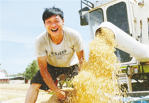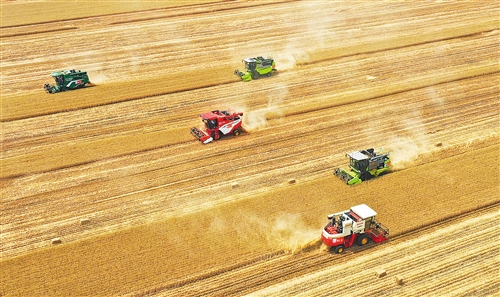 開封市尉氏縣邢莊鄉府李莊村,農機服務隊幫助村民收獲小麥。    李新義攝(中經視覺)
