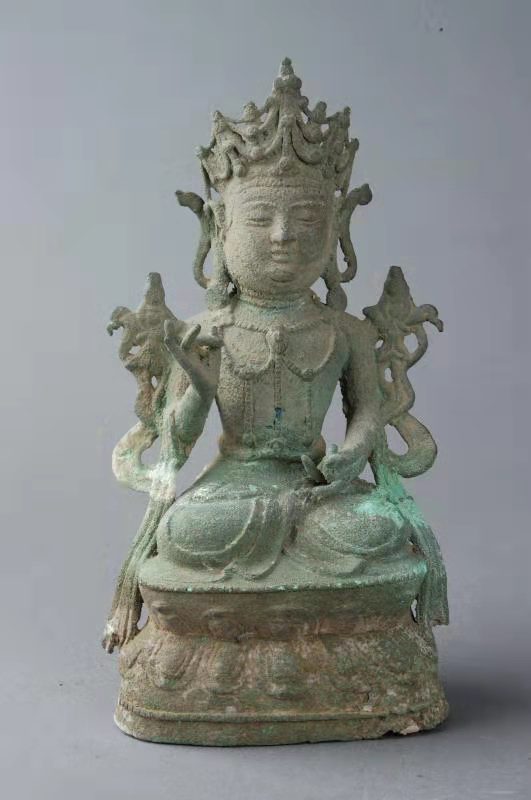 商水壽圣寺塔,高41.5米,為九級樓閣式磚塔。塔體從底至頂漸收勻稱,平面呈正六邊形。塔頂用鑄鐵鑄成葫蘆形寶頂,給人以挺拔雋秀之感。塔的層檐收放尺寸設計精妙,既保護了塔墻免遭雨雪侵蝕,又使塔體顯得莊重肅穆。塔身諸層外壁皆辟有圓券門、破子欞假窗,塔身各角砌出倚柱,檐下密布磚雕斗拱。塔內砌出塔心室和盤旋梯道,可逐層登高至塔頂。塔第一層,南面辟門,門楣上刻“明道二年癸酉歲三月一日丙寅時戊寅日,葬舍利院主。僧□□建□□功德塔”。說明建塔的年代是北宋。塔室為穹窿頂。東南、西南兩壁有破子欞盲窗各1個,西壁另辟一拱券門,有踏道可登至第二層塔心室。第二層,南面辟門,東南、西南兩壁各砌一盲窗,東壁另辟一門可沿踏道進入第三層。以上諸層大同小異。第四層,塔心室內北墻嵌石雕佛像3尊,兩尊盤膝正面像,一尊盤膝背面像。剎柱下端插入塔心室,上端置鐵質寶瓶,在不同部位還發現“風調雨順”“國泰民安”“周王千歲千千歲”“大明嘉靖二十八年九月吉日”“河南周府施舍西華小瑤集壽圣寺塔一座”等字樣,這些都說明了明代嘉靖年間,又重修了塔身。1998年9月,在維修該塔時,在天宮清理出明代銅佛像3尊,白釉瓷盤1只,白釉黑花瓷碗、白釉褐花瓷碗各1個,刻印大彌陀經1卷。銅佛像高約20厘米,其中一尊有“嘉靖三十一年”字樣,這一時期的周王為周敬王朱在鋌,這說明嘉靖三十一年周敬王朱在鋌為祈福曾將這批器物和經卷,置入了塔頂的鐵質寶瓶中。