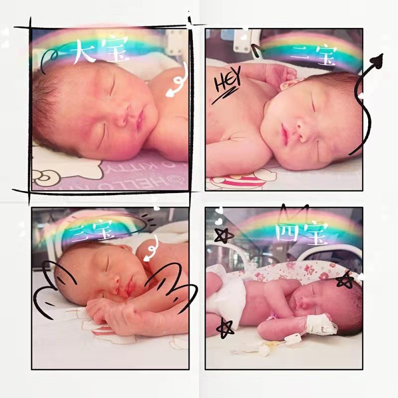 7月25日1時02分、03分、03分、04分隨著一陣陣啼哭聲,產婦經剖宮產“三鳳一龍”四胞胎相繼出生,體重分別為2180g、2120g、2030g、1520g,全身紅潤,哭聲響亮,被安全送入危重新生兒救治中心監護室進行重點監護。