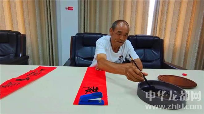 紅色經典創作室內,紅紙精裁,研墨蘸筆。朱再靈與另外兩名黨員商量,一番構思后,他揮毫寫下“跟著共產黨共圓中國夢 脫貧致富路齊心奔小康”,筆力蒼勁,對黨的深情浸透其中。