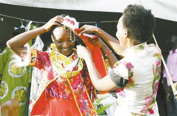 11月10日,學(xué)生在盧旺達(dá)卡永扎試穿中國服飾。