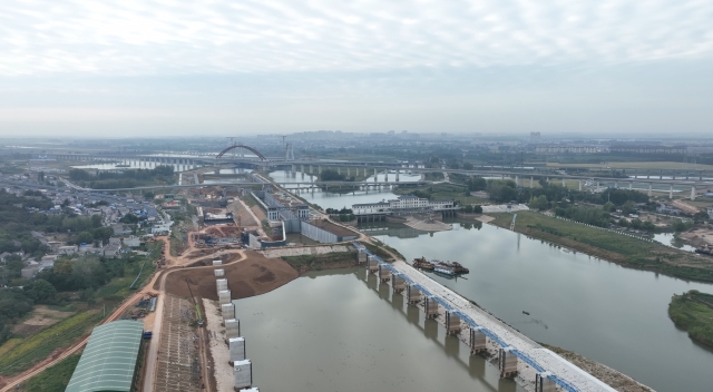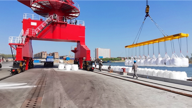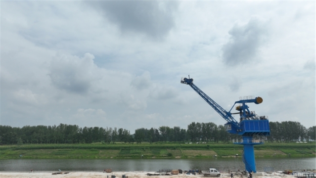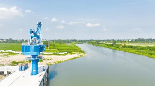 • 盛夏七月,在項城市東部的項城港,幾架“高聳入云”的新式固定式起重機的主體已安裝完畢,剩余的部件堆放在地上,巨大的框架和鮮紅的涂裝展示著它們的力量。一側,千噸級貨輪正停靠在長長的泊位前,起重機緩緩卸下貨艙內的散貨。