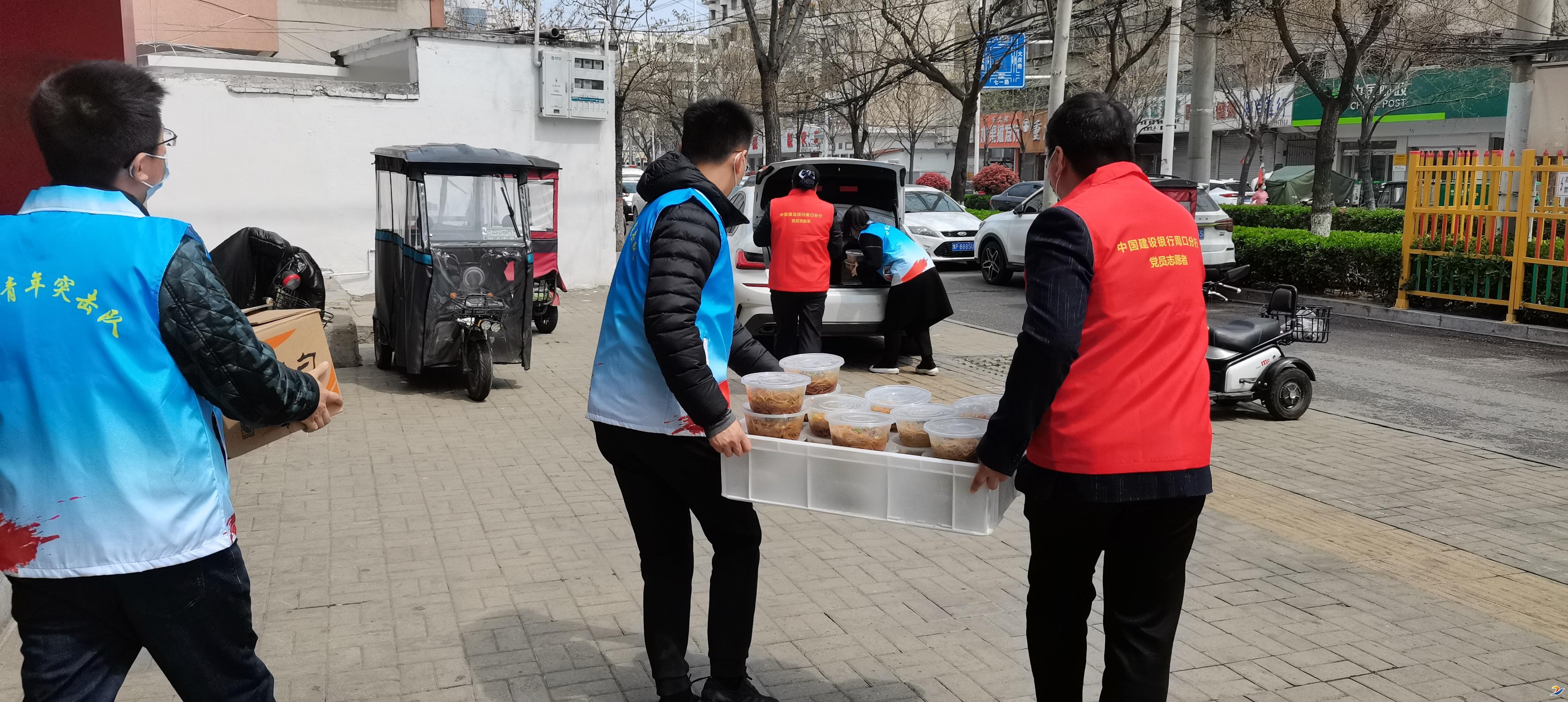 4月1日中午,在市區孫記sa湯門店,建行周口分行豫建青年突擊隊的成員和黨員志愿者們正忙著把剛做好的蒸餃、香腸、熱干面等分裝打包,放進保溫箱,然后統一送到疫情防控卡點。同時,為保證送餐安全,從做餐、送餐,整個流程都進行了嚴格的檢測和消毒,確保一線抗疫人員吃到放心食物。