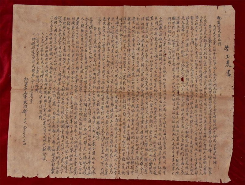1928年7月22日,彭德懷領(lǐng)導(dǎo)湘軍獨(dú)立第五師第一團(tuán)等部于湖南省平江城起義。不久,部隊(duì)即奉命改編為中國(guó)工農(nóng)紅軍第五軍第十三師。1930年6月,紅五軍在湖北省大冶縣編入紅三軍團(tuán)。根據(jù)《紅軍第五軍政治部告工農(nóng)書》的落款時(shí)間及內(nèi)容可以看出,此布告落款時(shí)間為1930年3月20日,它是研究紅五軍開展農(nóng)民工作、宣傳工作和紅五軍光輝歷史的重要史料佐證。