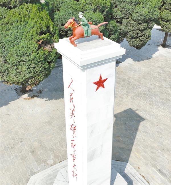 沈丘縣烈士陵園正中的人民英雄紀(jì)念碑頂端,有座雕塑——一匹高頭大馬揚(yáng)蹄飛奔,一位軍人策馬揚(yáng)鞭。這是沈丘人民對(duì)朱彬烈士的最高禮贊。