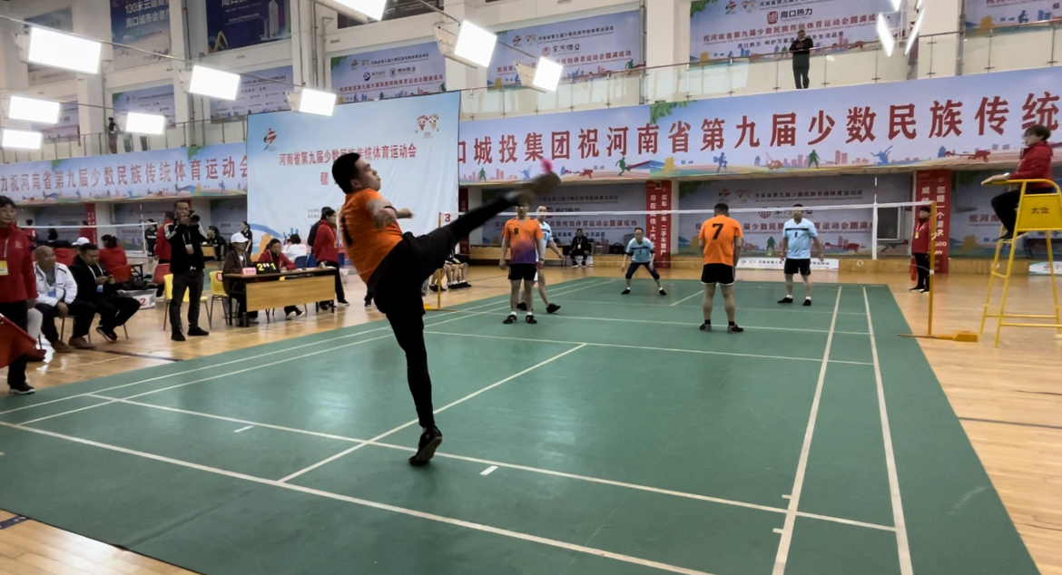 據了解,毽球運動是由侗族、苗族、水族同胞喜愛的傳統體育活動“手毽”演變而來的。它集羽毛球的場地、排球的規則、足球的技術為一體,是一種隔網相爭的體育項目。競賽時雙方各派3名選手出場,其技法以踢、觸為主,可用頭、腳及身體去接球,每人均可連續擊球2次,但不能用手臂去觸球。競賽采取三局兩勝制。②15