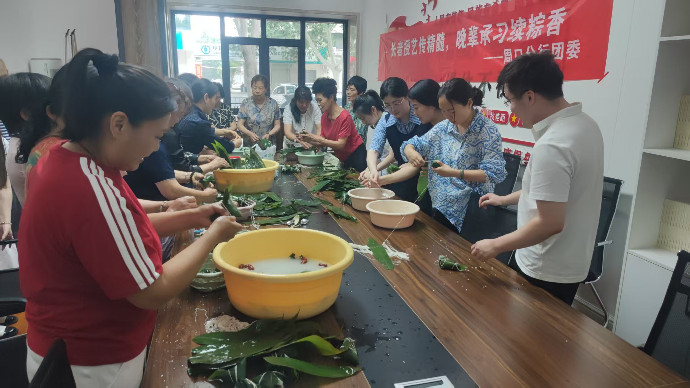 活動現場,該行離退休老黨員、老員工們化身“技藝導師”展示自己包粽子的手藝,耐心細致地向青年員工傳授包粽子的技巧。從粽葉的挑選、整理、折疊,到糯米、大棗的裝填、捆綁,長輩們手把手的教,青年們認真操作,在老員工的悉心指導下,一個個形態各異的粽子逐一成型。期間,大家聊工作聊生活,老員工分享以往工作和日常生活經驗,青年員工認真領悟,虛心請教,現場充斥著和諧安康的傳統節日氛圍。