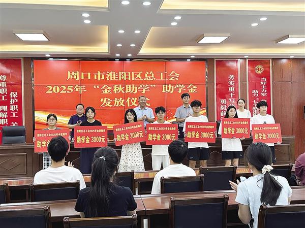 8月20日上午,淮陽區總工會舉行2025年“金秋助學”助學金發放儀式,為18名考上大學的困難職工子女每人發放“金秋助學”助學金3000元。記者 侯俊豫 通訊員 張艷榮 攝