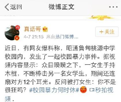 云南昭通一中學內一女生持棍打女同學并搧12耳光