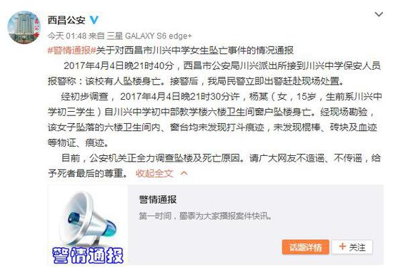 四川西昌一中學女生六樓衛生間墜亡 未現打斗痕跡
