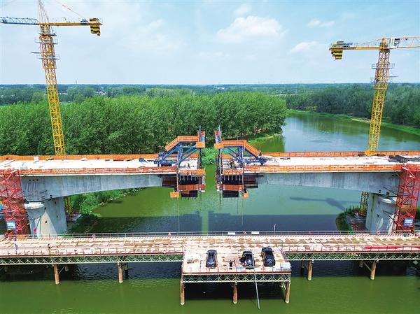 6月30日,中鐵七局的工人正在平漯周高鐵周口段跨潁河大橋上施工。平漯周高鐵周口段跨潁河大橋是中鐵七局在周口境內施工的三條跨河橋梁之一,于2023年動工,橋長416米,預計本月底合龍。