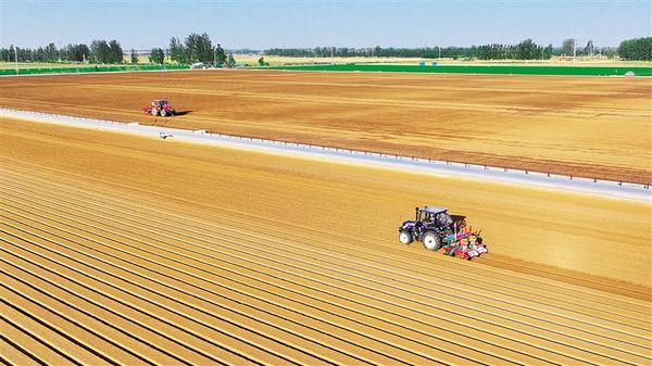 6月15日,扶溝縣西關高效農業示范區正在播種花生。該園區集育種、品種展示等功能于一體,把農業技術推廣和利用轉化為群眾致富的有效途徑。