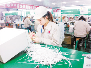 昨日,在三星手機耳機供應商日立亞電子淮陽有限公司生產車間,工人們正在生產線上忙碌著。淮陽縣近年來積極實施“工業強縣、旅游突破、城鄉統籌、四化同步”發展戰略,不斷調整工業產業結構,增加企業科技含量,以提升產品質量和市場競爭力,促進經濟轉型升級。(記者 侯俊豫 攝)