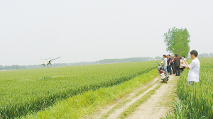 5月7日,一架小型直升機為小麥噴灑農藥。當前,正是小麥 “一噴三防”的關鍵時期,項城市三店鎮多方聯系,引進小型直升機為小麥高產示范田噴灑農藥,為豐產豐收奠定良好基礎。董方靈 攝
