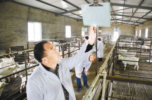 孫振偉原是當(dāng)?shù)刂那嗄昶髽I(yè)家,2008年初被西關(guān)村居民高票選舉為村黨支部書記,憑著對家鄉(xiāng)的強(qiáng)烈責(zé)任感和保護(hù)槐山羊特色品種的使命感,孫振偉帶領(lǐng)西關(guān)村立足本村作為槐山羊傳統(tǒng)養(yǎng)殖區(qū)的優(yōu)勢,于2010年成立沈丘縣槐山羊養(yǎng)殖發(fā)展有限公司,在省畜牧展交易會上,與鄭州鄭源公司合作,共同簽約了投資6000萬元建設(shè)槐山羊原種保護(hù)、繁育、深加工項(xiàng)目。同時(shí)與華中農(nóng)大建立技術(shù)合作關(guān)系,投資800萬元建成“槐山羊原種保護(hù)和繁育中心”,規(guī)劃設(shè)計(jì)了化驗(yàn)室、消毒室、提純復(fù)壯室、品種基因室等配套規(guī)范設(shè)施,不僅為國家級優(yōu)良品種槐山羊的保種提純工作提供了科研平臺和寶貴數(shù)據(jù)庫,“槐山羊提純復(fù)壯良種繁育技術(shù)研究與應(yīng)用”成果還獲得2013年度周口市科技進(jìn)步一等獎。經(jīng)過提純復(fù)壯,目前中心存欄特征明顯的槐山羊母羊860只、種公羊36只,在此基礎(chǔ)上,計(jì)劃建成占地100畝的槐山羊養(yǎng)殖小區(qū),槐山羊板皮、肉制品等深加工項(xiàng)目都已經(jīng)開始實(shí)施。 “這些是經(jīng)過第五輪提純復(fù)壯繁育的槐山羊,目前可以說是最純種的槐山羊了。”孫振偉指著一批剛出生的小羊向我們介紹。