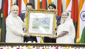 印度和孟加拉國(guó)簽署多項(xiàng)文件加強(qiáng)合作      6月6日,在孟加拉國(guó)達(dá)卡舉行的新聞發(fā)布會(huì)上,孟加拉國(guó)總理哈西娜(右)向印度總理莫迪贈(zèng)送電站項(xiàng)目效果圖。孟加拉國(guó)總理哈西娜6日與正在孟加拉國(guó)訪問(wèn)的印度總理莫迪舉行會(huì)談,兩國(guó)當(dāng)天簽署多項(xiàng)文件加強(qiáng)合作。新華社發(fā)