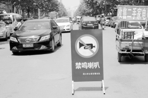 圖②我市各考點外設置了禁鳴喇叭警示牌。
