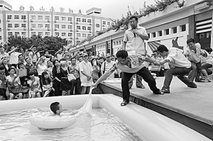 廣東省惠州市教育局高度重視學校和學生的安全管理工作,在全市預防學生溺水安全專項活動中,創新教育形式,開展防溺水“體驗式”教學。圖為惠州市教育局在南山學校舉辦全市中小學防溺水體驗式教學觀摩現場會,惠州志愿者救撈隊示范通過立式人鏈智救溺水者。 袁曙文 攝