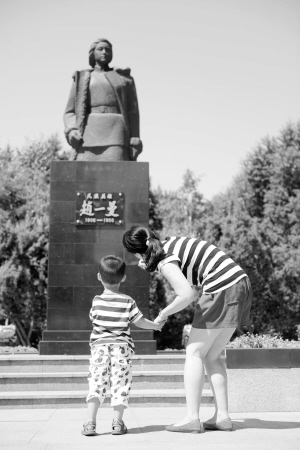 7月5日,在哈爾濱東北烈士紀念館旁的烈士廣場,一名母親為孩子講述民族英雄趙一曼的英勇事跡。在“七七事變”紀念日即將到來之際,眾多游客來到哈爾濱東北烈士紀念館參觀,接受愛國主義教育。右圖為一名訪客在哈爾濱東北烈士紀念館內(nèi)參觀記錄。新華社記者 王凱 攝