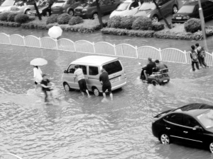 昨日,大雨后的周口市區七一東路一片汪洋,平常車載人,雨后人推車。