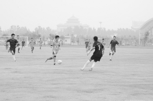 與此同時,體育館東側足球場上則上演著新疆競技隊和撫順新野隊的精彩對決。身材高大的新疆競技隊隊員的表現搶眼,讓周口球迷大開眼界。