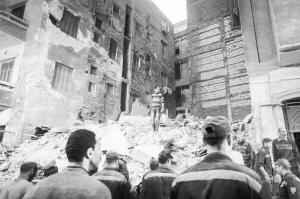 3月11日,在埃及首都開羅,救援人員在樓房倒塌事故現場展開工作。